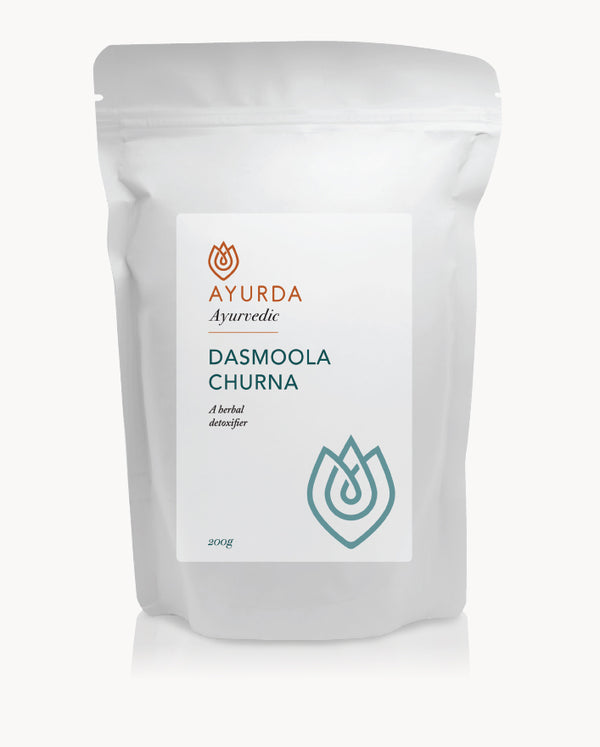 A herbal detoxifier. Dashmoola Churna, prepared from the roots of 10 different herbs, is a potent anti-oxidant and body detoxifier. This unique blend of herbs is known for its ability to cleanse the internal pathways of our body, thus easing symptoms of Vata imbalance. Dashmoola Churna acts as a bone and tissue healer, enhances nourishment and works as a rejuvenation tonic.