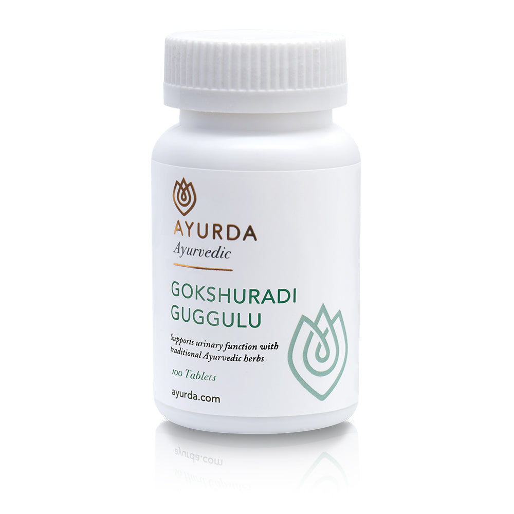 Gokshuradi Guggulu contains Gokshura (Tribulus terrestris) which is traditionally used in Ayurvedic medicine as a diuretic while Haritaki (Terminalia chebula), Bibhitaki (Terminalia belerica) and Amalaki (Emblica officinalis) are recognised as natural antioxidants. The properties of these herbs are enhanced when mixed with Guggulu (Commiphora mukul).